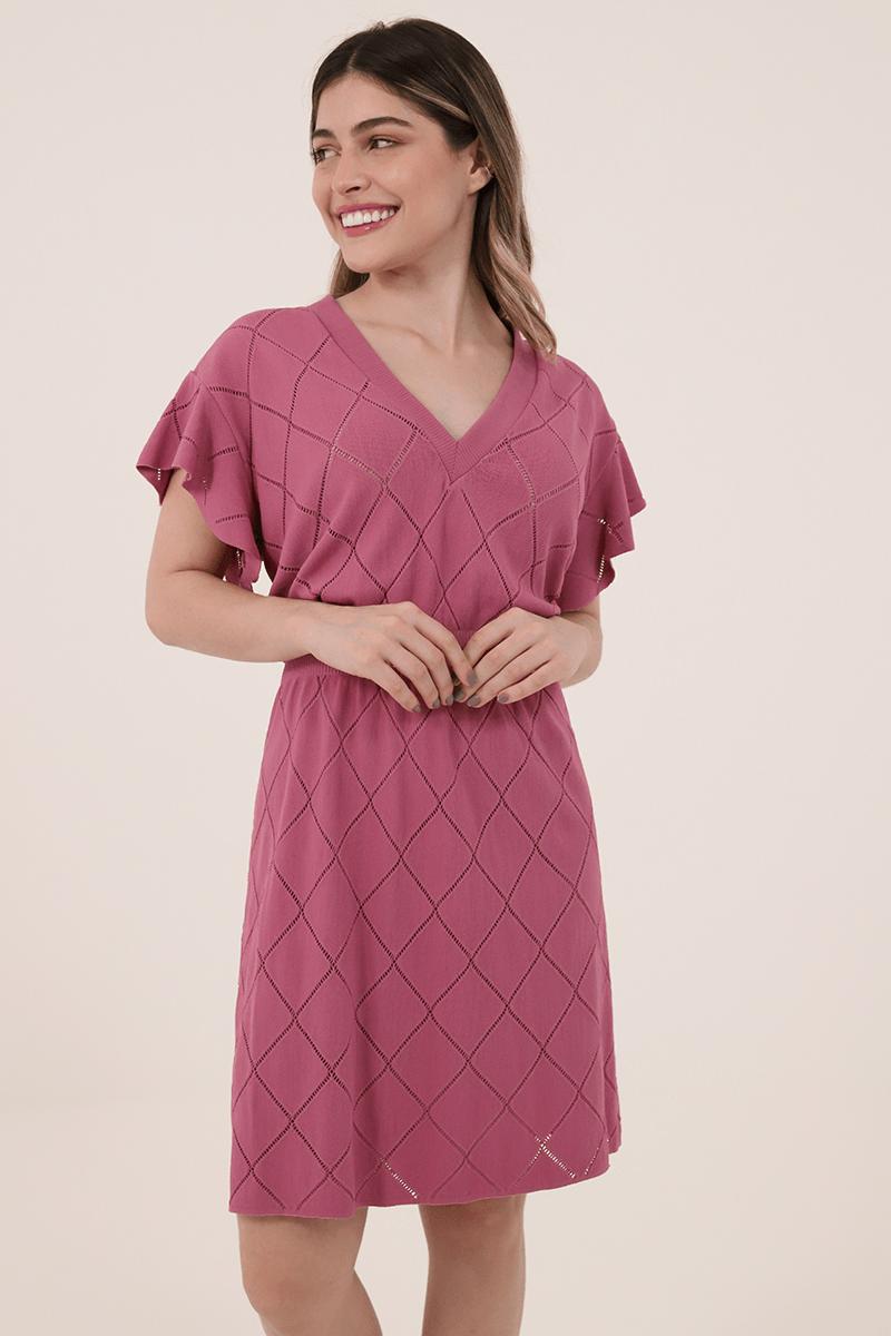 Confeccionada em renda sem costura e elastano 40, possui mangas curtas com seleção de losangos, modelagem evasê, decote V, manga godê, canelado na cintura e comprimento acima dos joelhos.