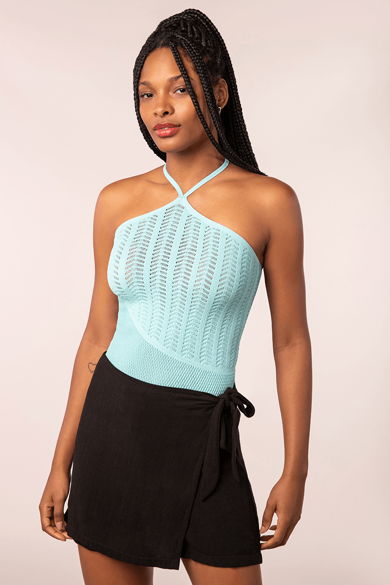 Blusa frente única com amarração no pescoço. Possui mix de padronagens que remetem ao tricô. Modelo que evidencia e valoriza as costas, com comprimento regular e possui transparência. Confeccionada em tecnologia renda sem costura.