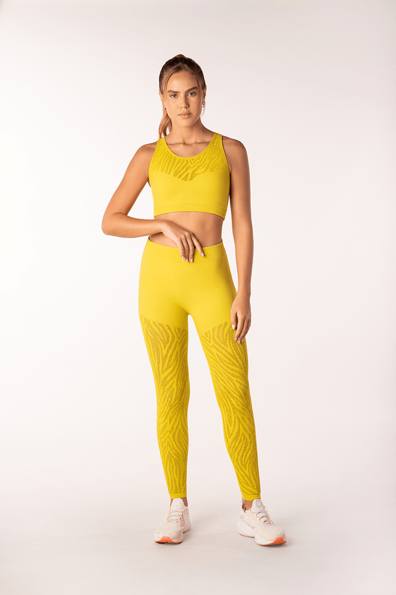 Legging com cós canelado e elástico firme rebatido. Possui recorte visual que leva padronagem animal print arrastão na perna. Comprimento longo, no tornozelo. Feita em renda sem costura com acabamento antimicrobial. Composição: 93% Poliamida, 7% Elastano.