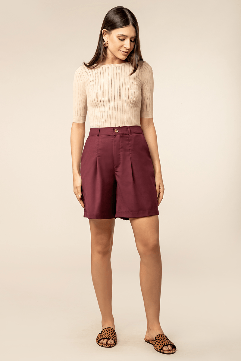 Bermuda estilo alfaiataria com pregas frontais. Fechamento em botão e zíper, possui passantes, bolso faca frontal e bolso falso traseiro. Para um inverno pesado, combine com nossas meias-calça. Comprimento acima do joelho. Peça moderna e versátil. Poliéster 73%, Viscose 25%, Elastano 2%.
