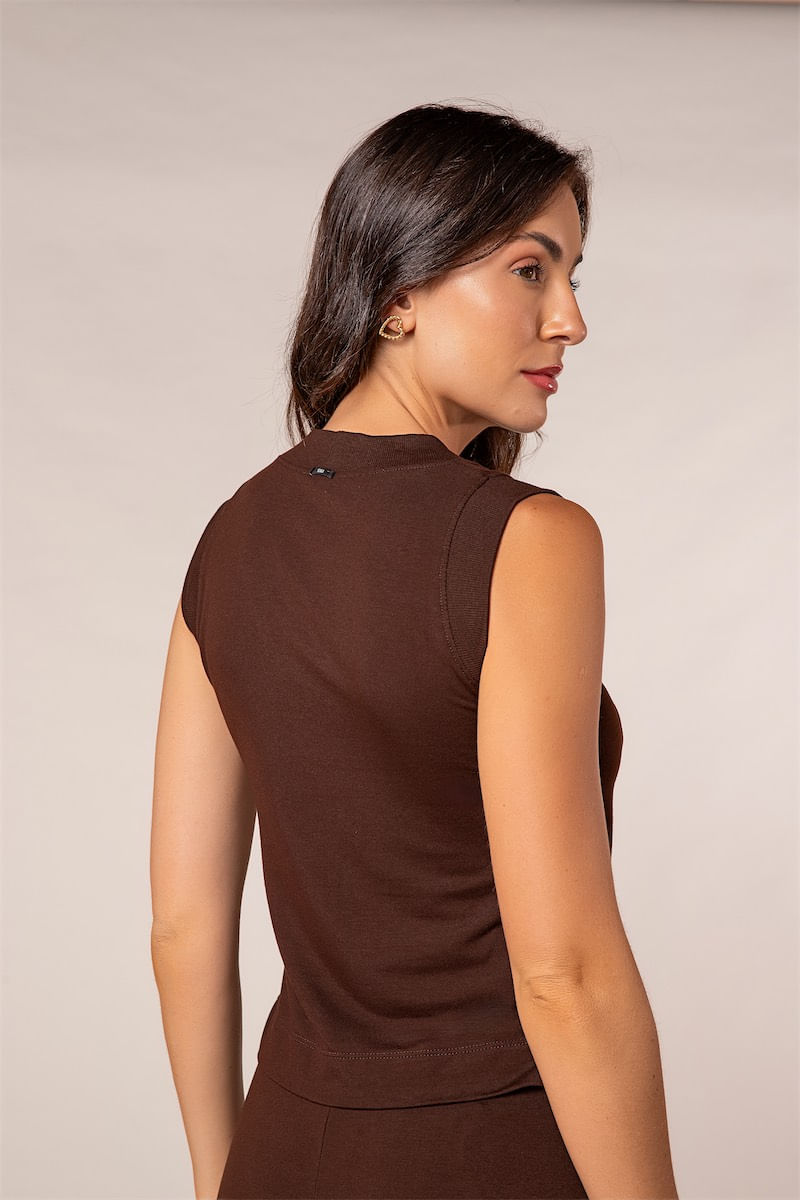 Regata de ombros largos, lembrando uma "muscle tee", de decote V, acabamentos em ribana e com fenda lateral. Comprimento na altura do cós, é uma peça que valoriza o busto e dá a sensação de afinar a silhueta. Composição: 95% Viscose, 5% Elastano.