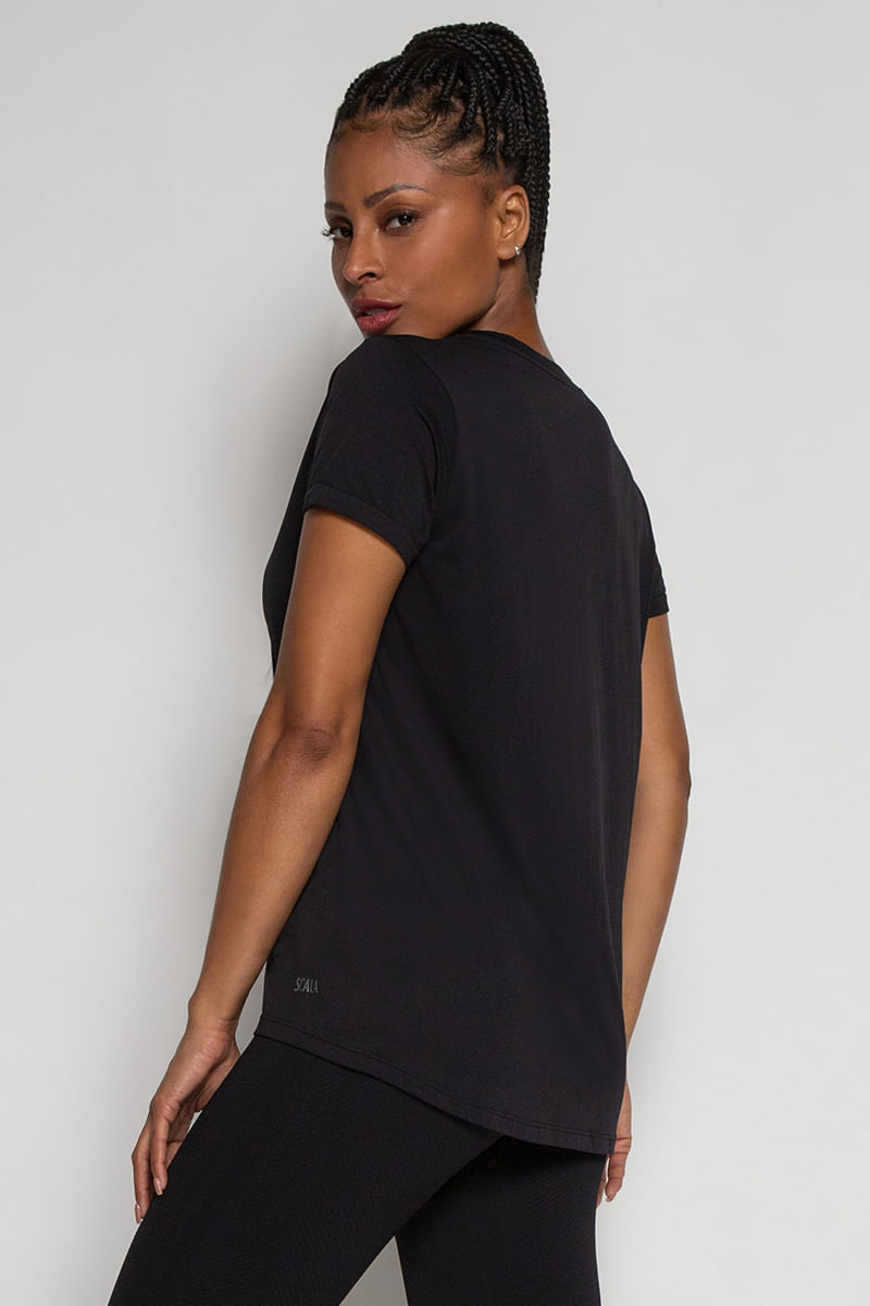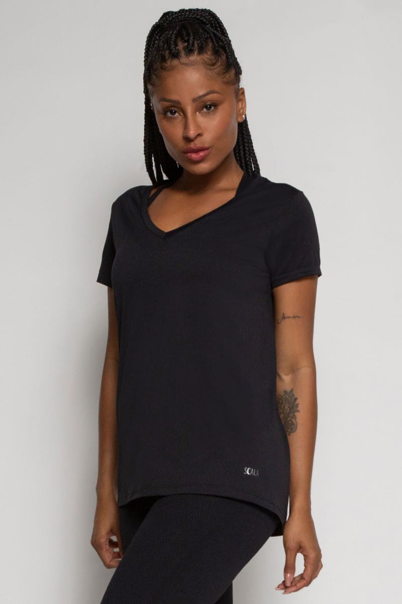 Blusa decote V manga curta. Acabamento do decote com cobre gola, que não deixa a costura aparente. Barra com formato abaulado, com a parte posterior mais alongada. Apresenta tecnologia com proteção solar UV 50+. Acabamento antimicrobial. Tecnologia sem costura. Composição: 100% Poliamida.