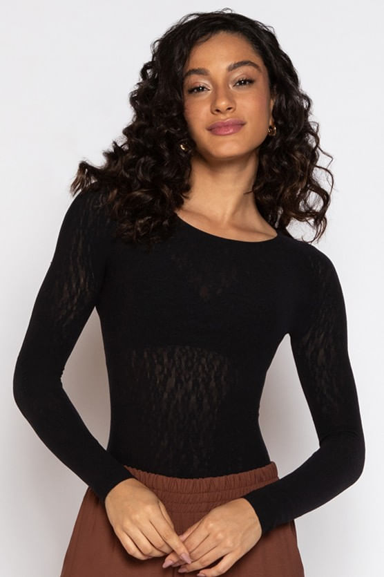 Blusa manga longa com desenho que remete ao animal print. Gola careca. Possui leve transparência e é ideal para compor looks com sobreposição ou com demais produtos de nossa marca. Informação de moda inspirada na tendência de transparência e animal print. Produzido em renda sem costura e elastano 20. Composição: 92% Poliamida, 8% Elastano. Código do produto: I06414