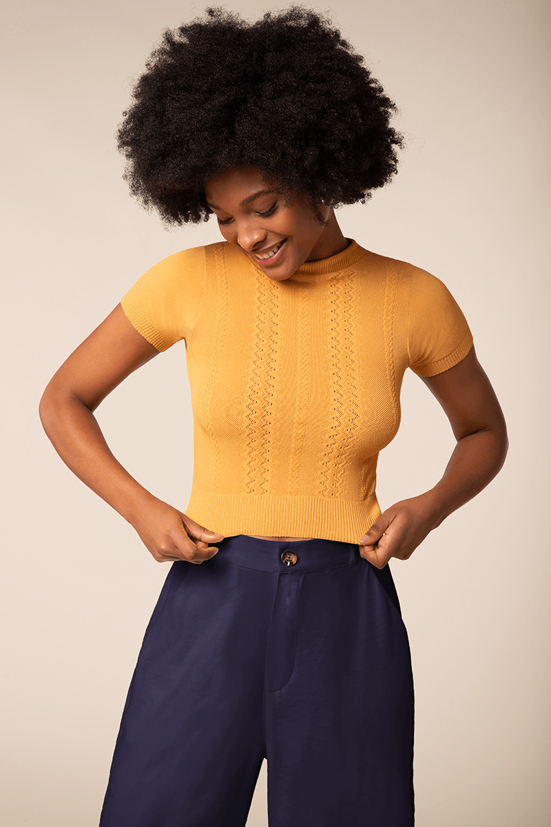 Blusa cropped manga curta com gola alta e desenho central similar a chevron. Peça justa ao corpo, suas extremidades são caneladas. Confeccionada em tecnologia renda sem costura no elastano 40. Peça com baixa transparência.