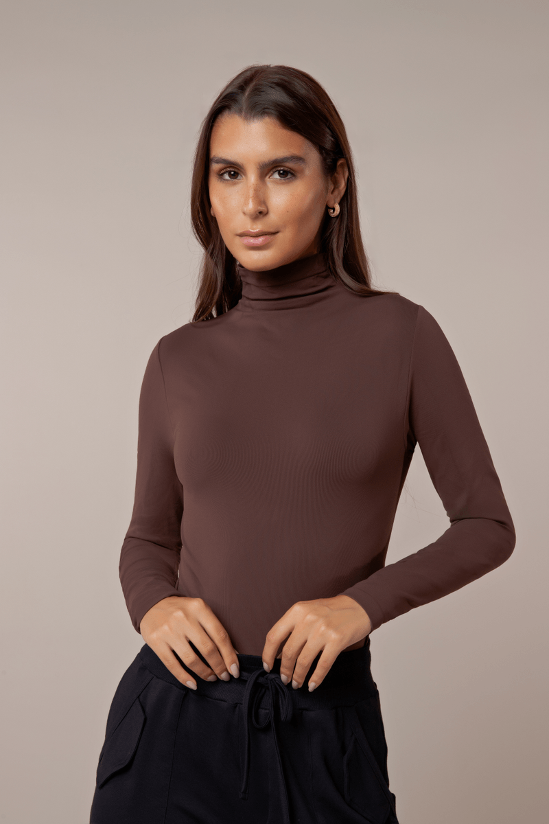 Blusa manga longa e gola alta. Peça tecida em tecnologia sem costura, com trama fechada que ajuda a manter a temperatura corporal.