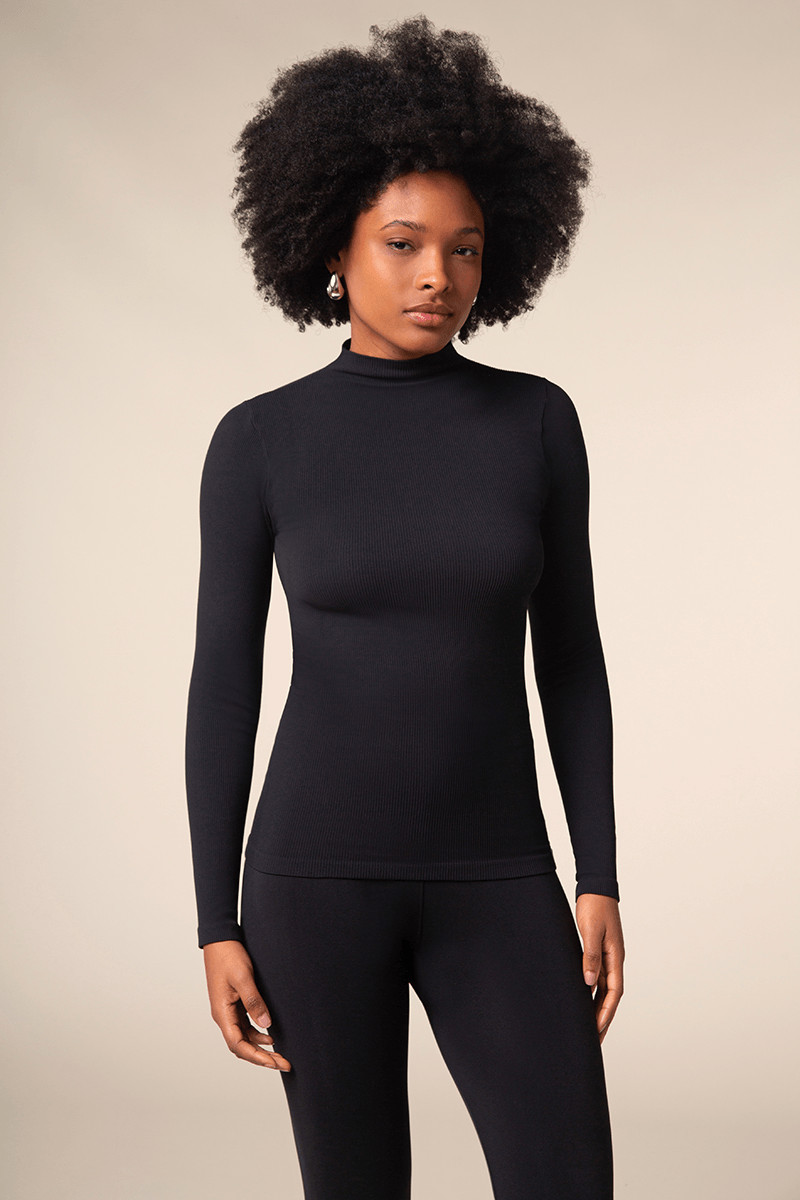 Blusa de manga longa com gola alta canelada. Promove isolamento térmico, mantendo a temperatura corporal e retardando a troca de calor com o ambiente externo. Indicada para uso externo por ser bloqueadora de vento e ser sempre a camada mais próxima da pele, além da propriedade que neutraliza odores. Tecida na tecnologia sem costura com fios especiais.