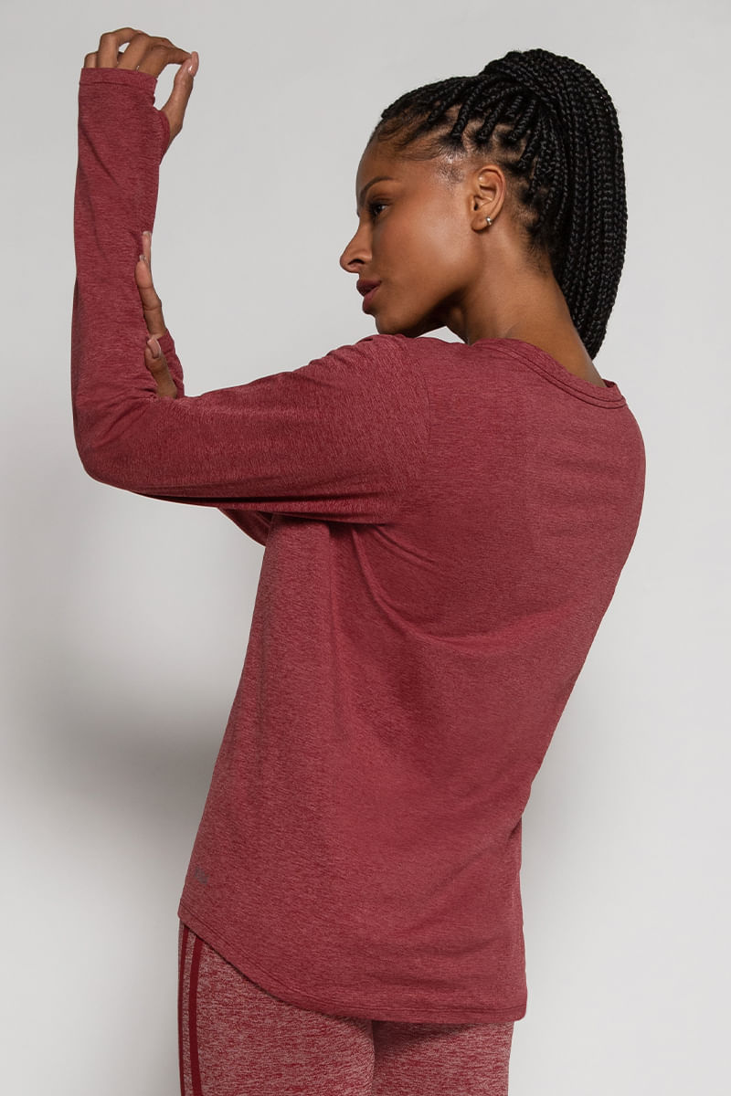 Blusa decote V, manga longa com abertura para o polegar. Acabamento do decote com cobre gola, que não deixa a costura aparente. Barra com formato abaulado, com a parte posterior mais alongada. Acabamento antimicrobial. Tecnologia sem costura. Composição: 100% Poliamida. Código do produto: A06520