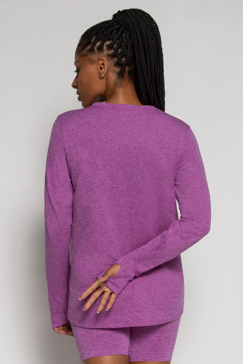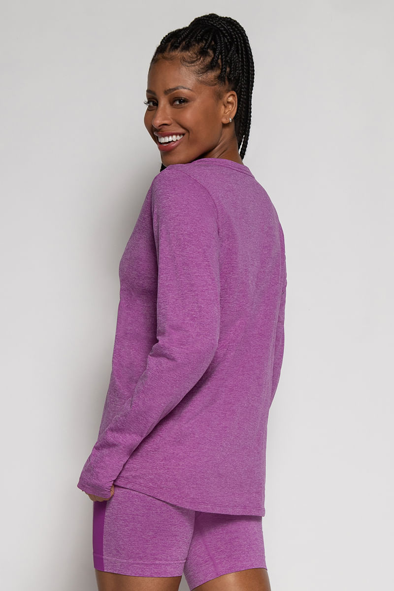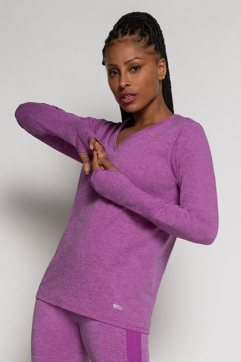 Blusa decote V, manga longa com abertura para o polegar. Acabamento do decote com cobre gola, que não deixa a costura aparente. Barra com formato abaulado, com a parte posterior mais alongada. Acabamento antimicrobial. Tecnologia sem costura. Composição: 100% Poliamida. Código do produto: A06520