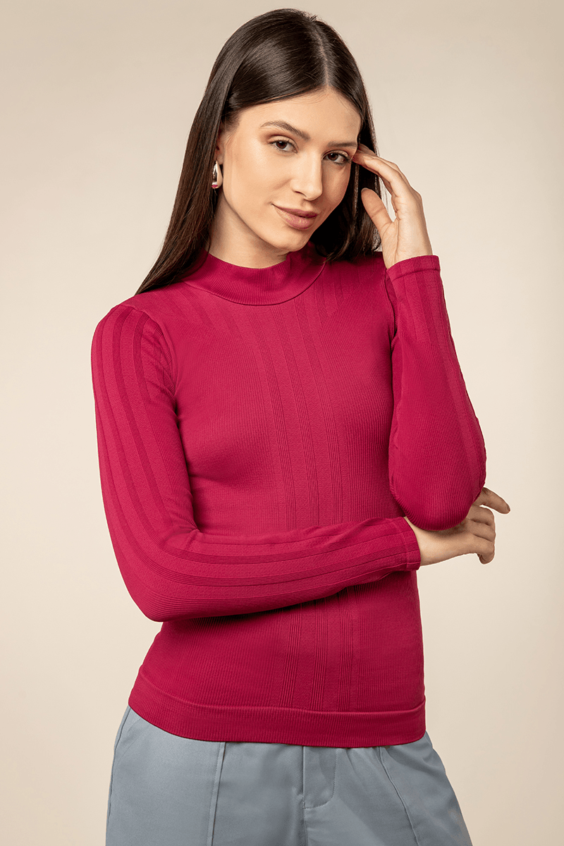 Blusa de manga longa com gola alta. Possui mix de canelados que compoêm um desenho que alonga a silhueta. Gola aplicada canelada para melhor anatomia. Confeccionada em tecnologia sem costura. Poliamida 98%, Elastano 2%.