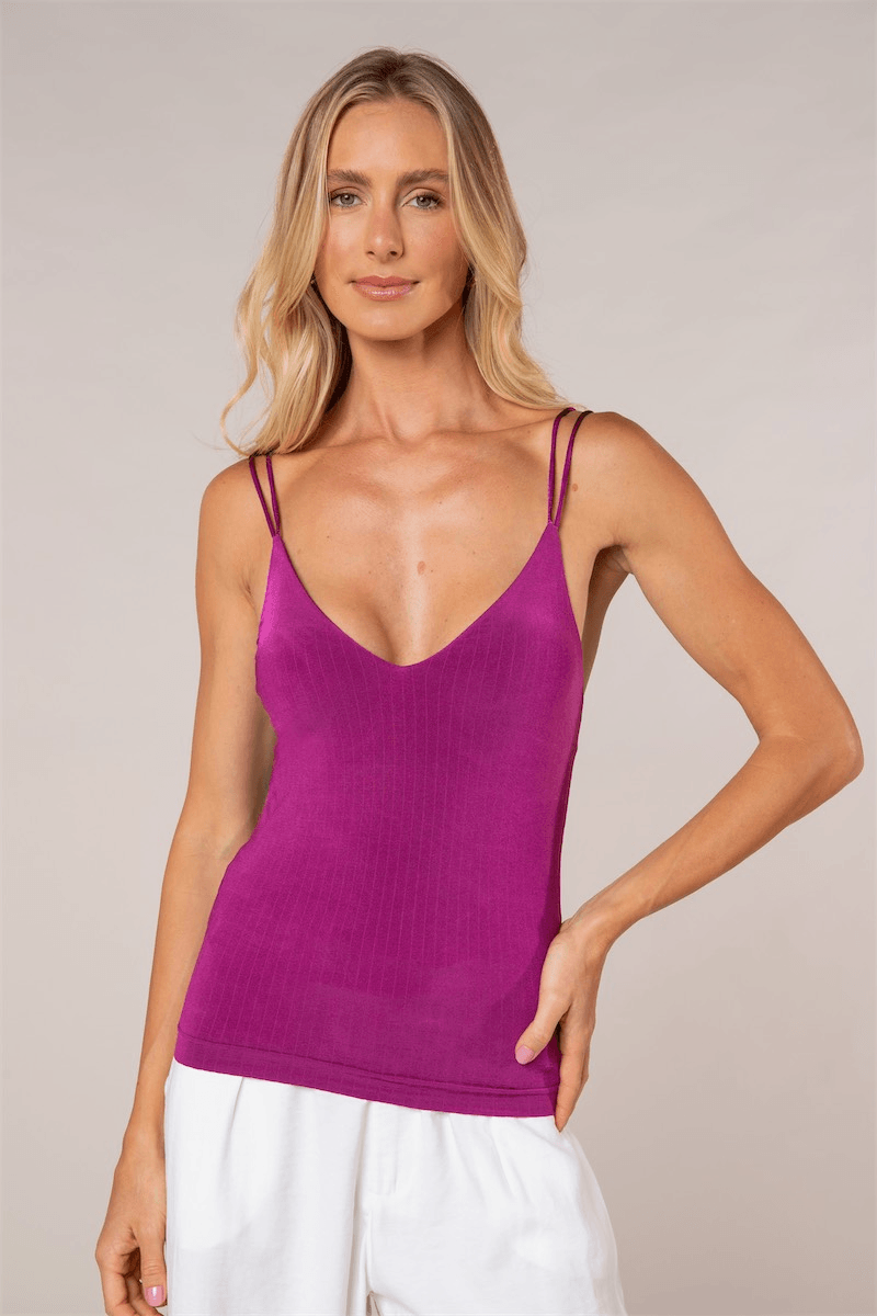 Blusa com alças duplas e leve textura canelada larga. Possui modelagem justa ao corpo e decote mais profundo em V, o modelo valoriza a silhueta e o colo, e evidencia também ombros e as costas. Tem top interno e é feita em tecnologia sem costura com fio brilho.