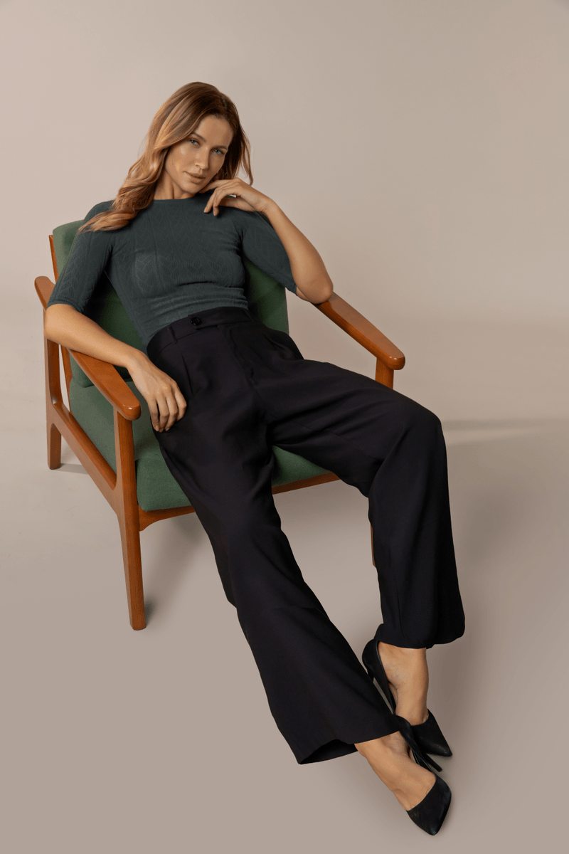 Calça modelo pantalona com pregas frontais. Fechamento em botão e zíper. Esse modelo valoriza a silhueta, a deixando alongada e elegante. Possui bolsos faca e passantes. Combine-a com blusas da coleção e acessorize. Feita com tecido plano alfaiataria de viscose.