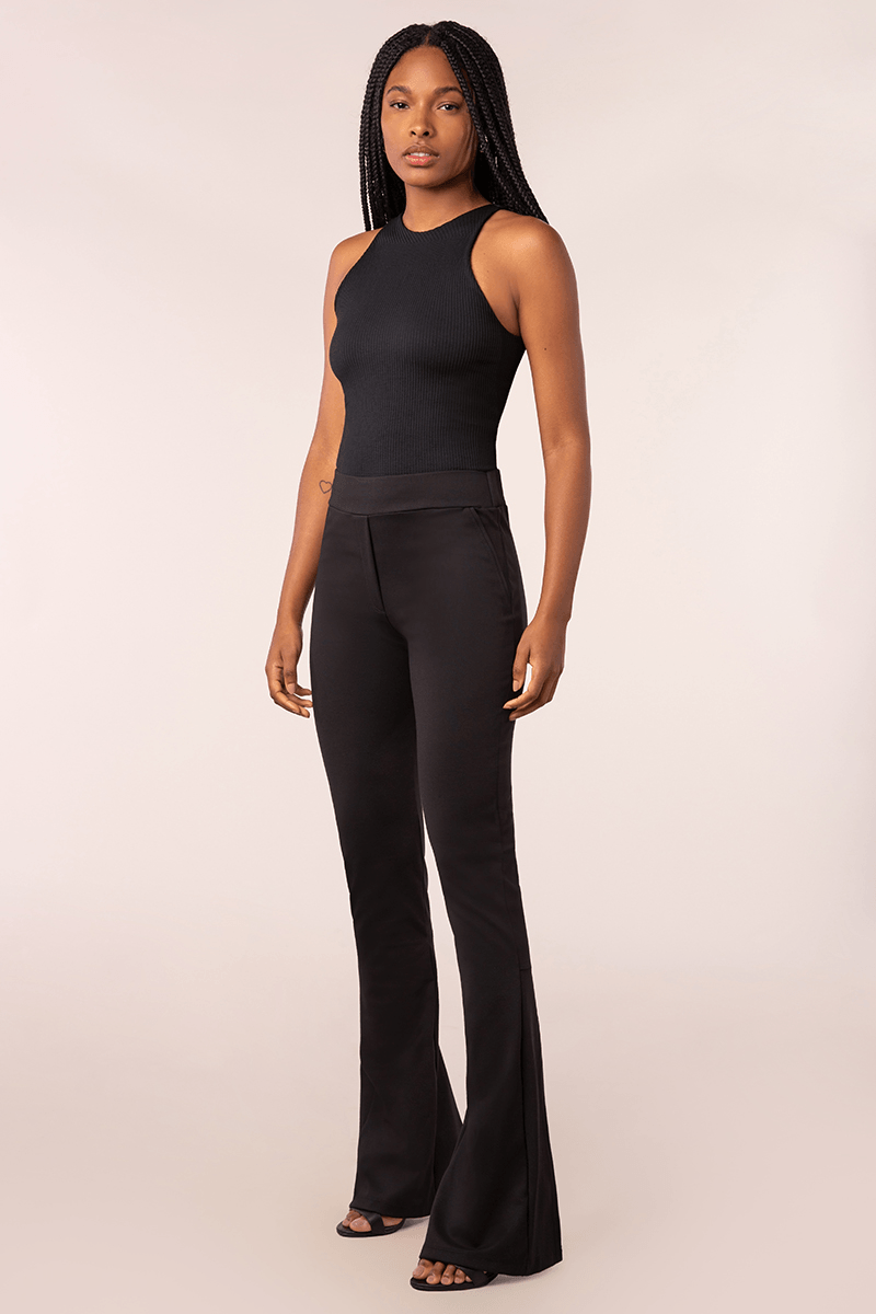 Calça flare de cintura alta e fenda traseira próxima à barra. Seus bolsos e vista são falsos e seu cós é em elástico macio embutido, proporcionando conforto e vestibilidade. Peça com design moderno e sofisticado. Composição: 60% VISCOSE, 36% Poliamida, 4% Elastano