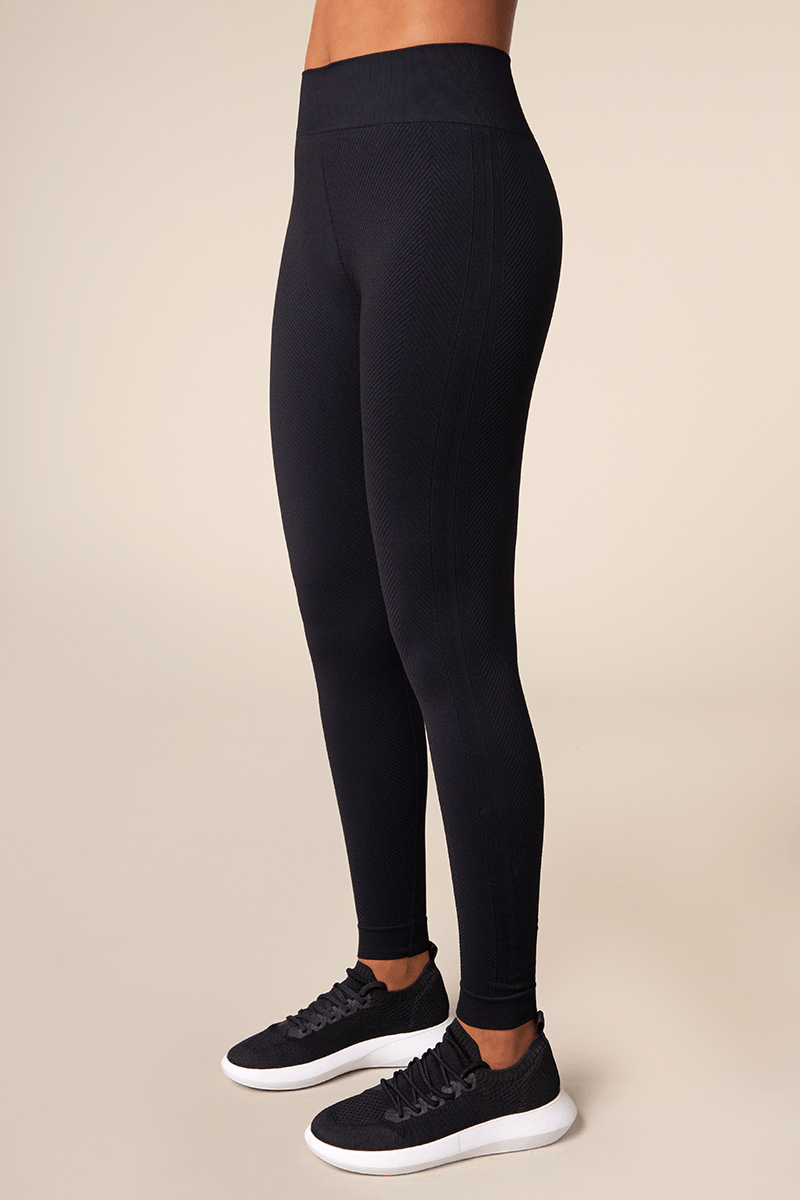 Legging com cós duplo, firme, canelado e sem costuras. Recorte anatômico e costura flat no entrepernas para não marcar. Faixas laterais caneladas. Trama com desenhos canelados em chevron. Acabamento antimicrobial. Tecnologia sem costura.