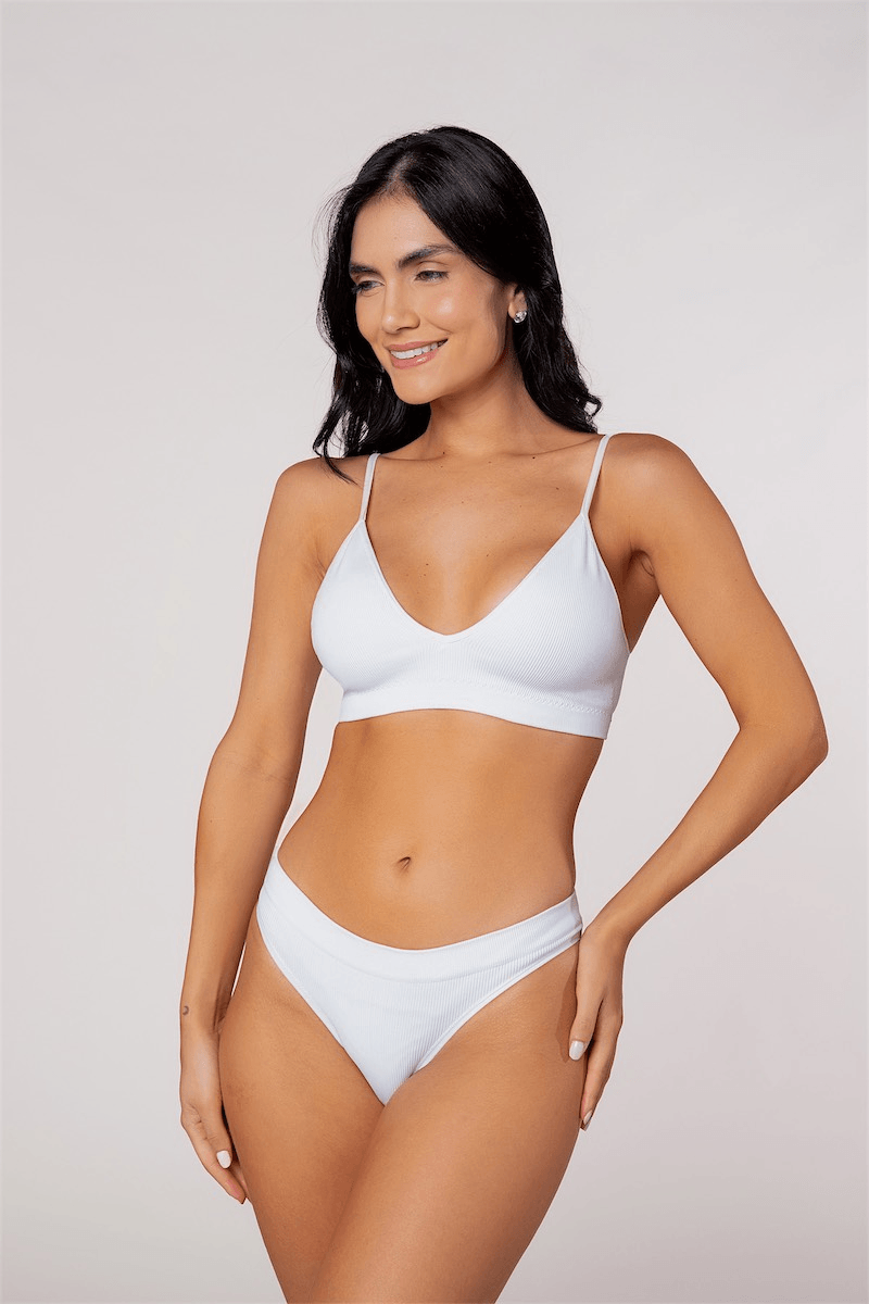Média cobertura. Tanga sem costura com trama canelada. Cós macio que proporciona segurança e conforto sem apertar.