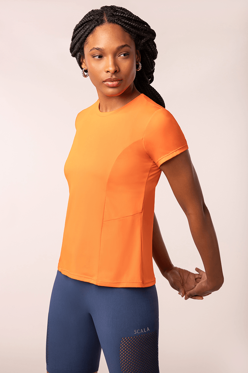 Camiseta de modelo levemente acinturado, com recortes de tecido texturizado. Seu recorte estratégico alonga a silhueta. Tecido confortável e respirável ideal para a prática de exercícios.