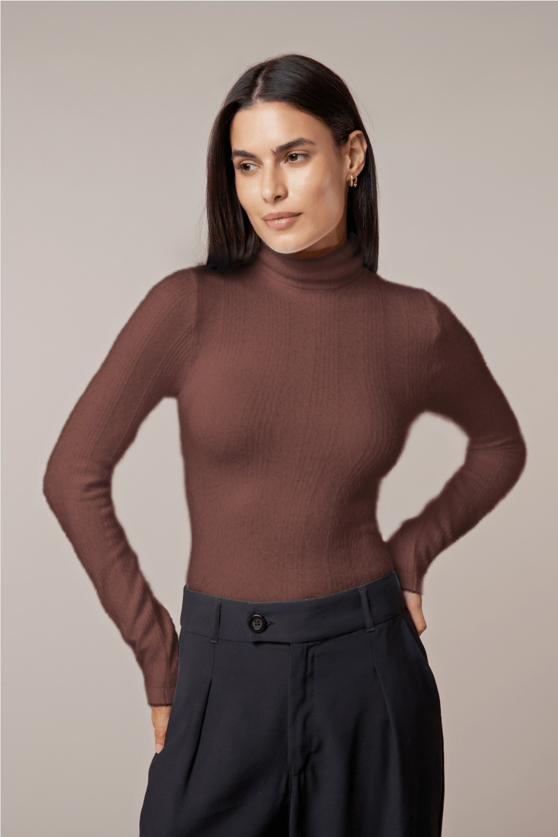 Blusa manga longa e gola alta com canelado no corpo. Malha de fio pelo e tecnologia exclusiva que ajuda a manter a temperatura corporal. Combinação especial de fios que proporciona toque macio e sedoso.