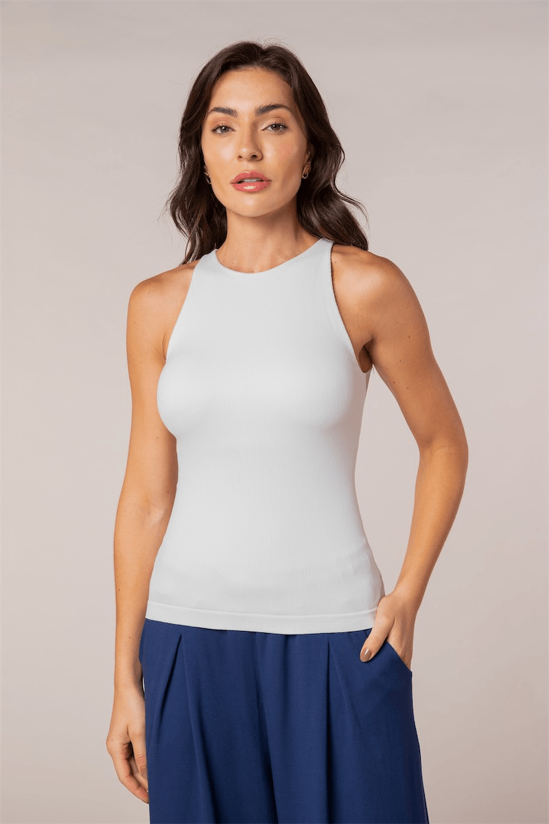Regata cava americana com top interno que auxilia na sustentação e conforto. Malha canelada que alonga o corpo. Cavas retas que valorizam os ombros. Tecnologia sem costura.