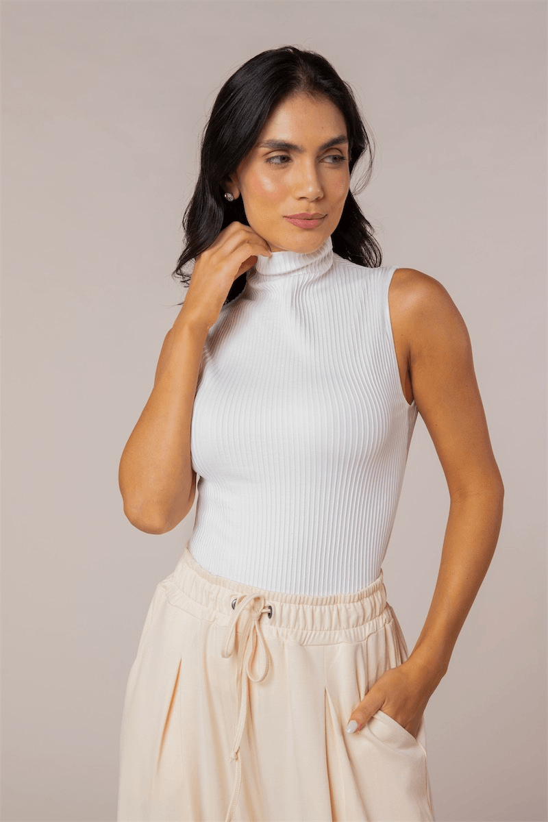Regata gola alta com malha canelada que alonga o corpo. Tecnologia sem costura. Composição: 98% Poliamida, 2% Elastano.