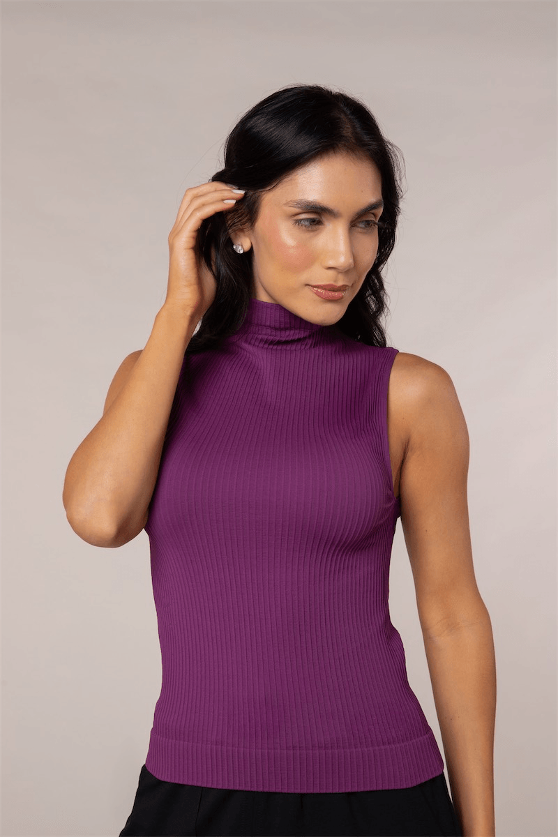Regata gola alta com malha canelada que alonga o corpo. Tecnologia sem costura. Composição: 98% Poliamida, 2% Elastano.