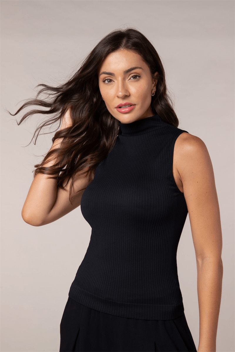 Regata gola alta com malha canelada que alonga o corpo. Possibilita o uso de diversos sutiãs da linha. Tecnologia sem costura.