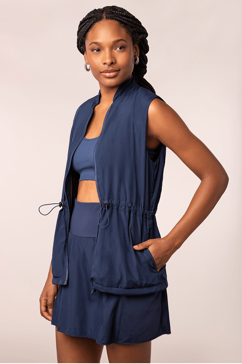 Colete liso com gola média, ajuste regulável na cintura, forro e fechamento por zíper, com bolsos frontais. Ideal para compor como terceira peça tanto em dias mais frios quanto para maior segurança ao se exercitar.