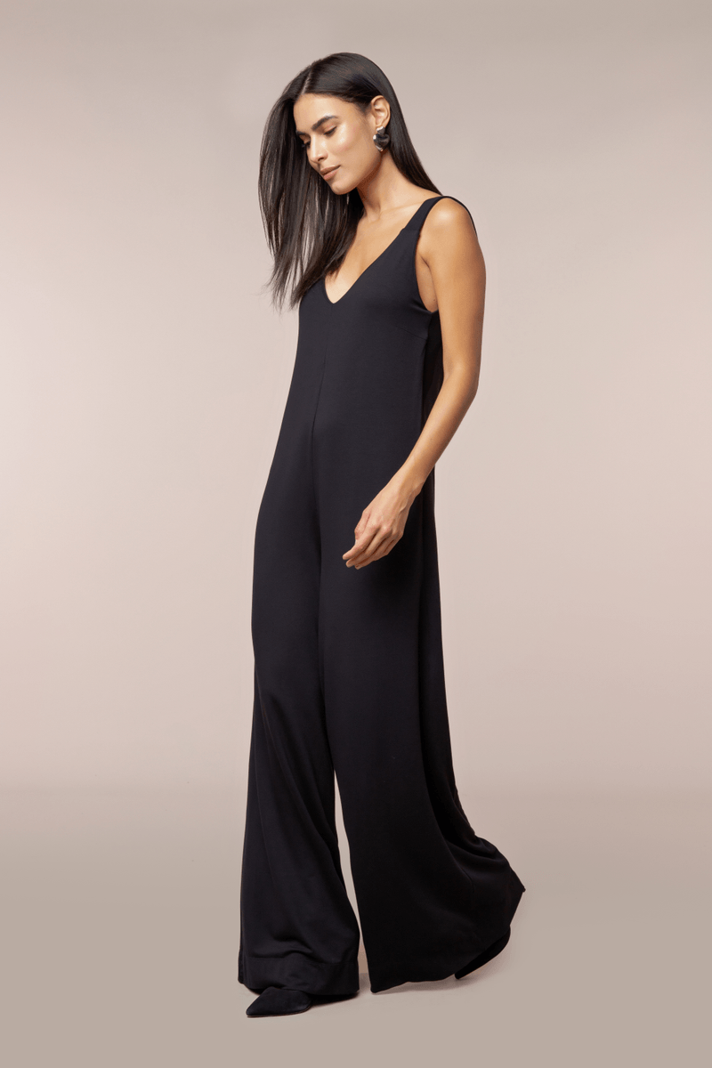 Macacão de comprimento longo, feito em moletinho de viscose, com alças largas em ribana reforçada, decote V frente e costas e de modelagem ampla das cavas até as pernas. Peça versátil e confortável que evidencia e valoriza o colo e as costas.