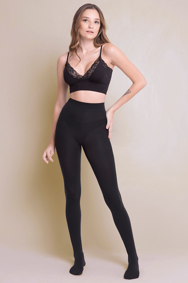 Meia-calça opaca fio 80, ideal para baixas temperaturas. Não tem demarcação de calça nem ponteira.