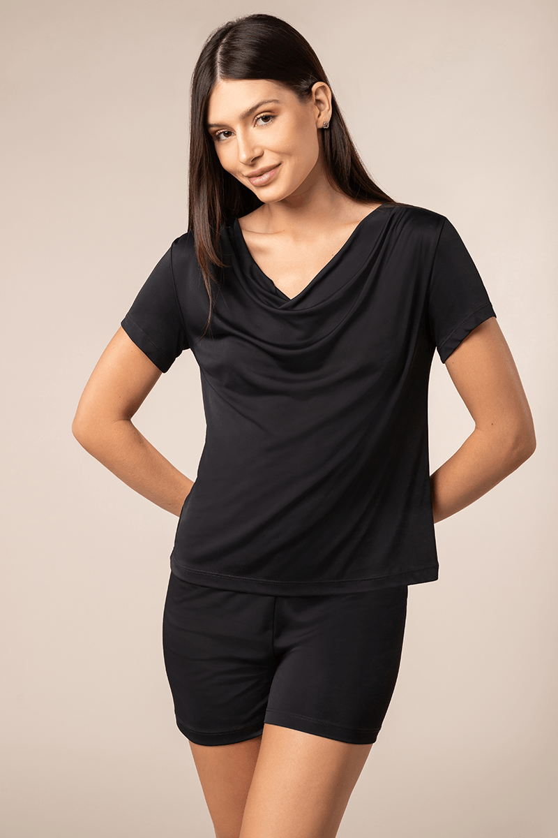 Conjunto de pijama em liganete. Blusa de manga curta e decote degagê, conhecido como gola boba. Short curto com elástico macio embutido no cós. Modelo elegante e confortável.