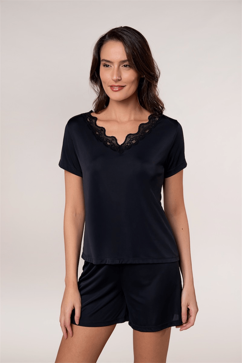Conjunto de pijama em liganete. Blusa de manga curta em comprimento regular, com decote V com renda aplicada . Short curto com elástico embutido no cós. Peças de toque confortável, macio, gelado, ótimas para dormir em climas mais quentes. Composição 100% Poliamida.