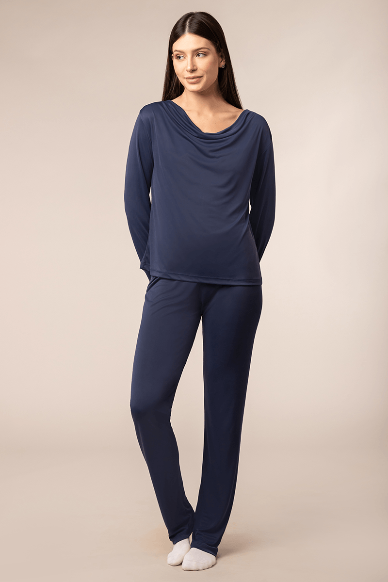 Conjunto de pijama em liganete. Blusa de manga longa e decote degagê, conhecido como gola boba. Calça em modelo reto e comprimento longo, com elástico macio embutido no cós. Modelo elegante, confortável para climas mais frescos.