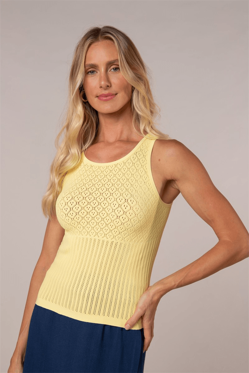 Regata de alças largas com mix de texturas. Sua modelagem é justa ao corpo, modela a cintura e realça os ombros, com comprimento regular. Blusa versátil e coringa na composição de looks formais e casuais. Tem leve transparência. Confeccionada em raschel em elastano 40.