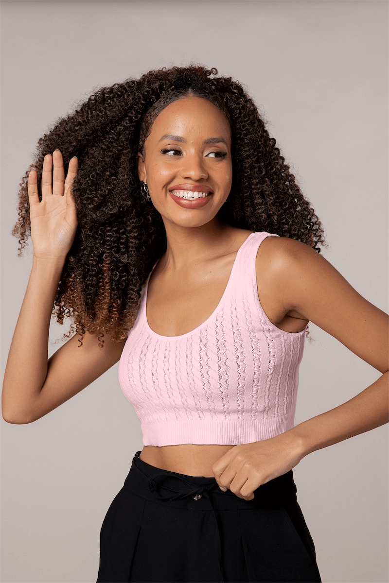 Regata cropped com textura de tranças e decote em U. Este modelo valoriza o corpo e as curvas, podendo ser usada com o cardigan como conjunto. Confeccionada em raschel em elastano 40.
