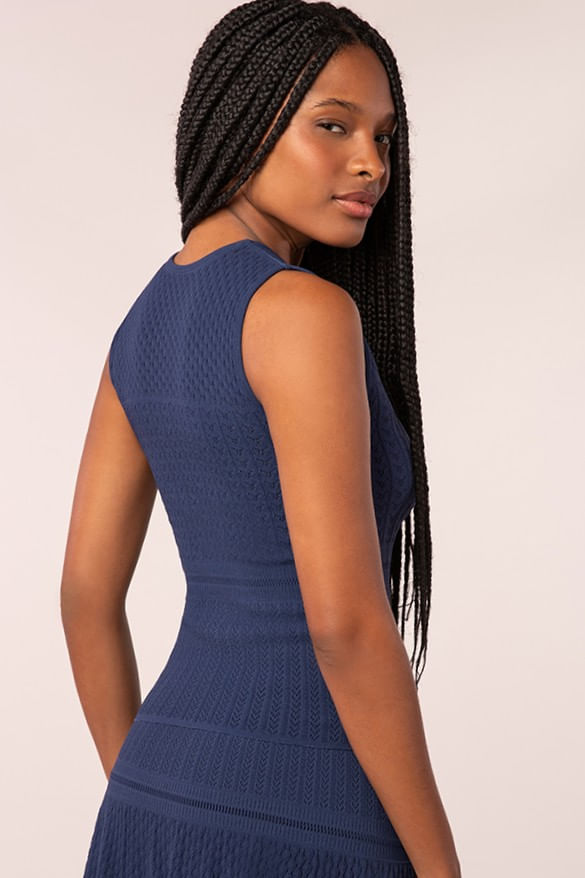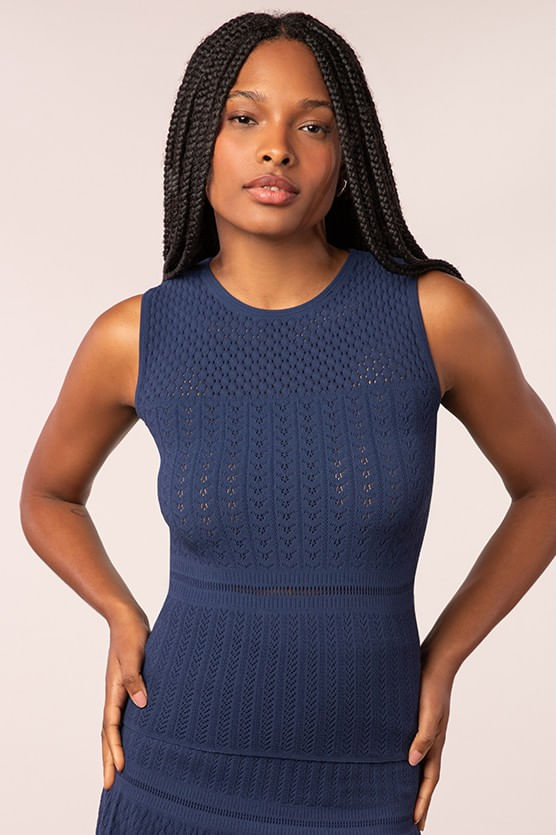 Regata modelo machão, com alças largas e mix de texturas com pontos diferenciados no corpo da blusa. Diferenciada com decote redondo e comprimento regular. Modelagem ajustada e acinturadas, valoriza as curvas do corpo e oferece sofisticação ao look. Tecnologia renda sem costura.