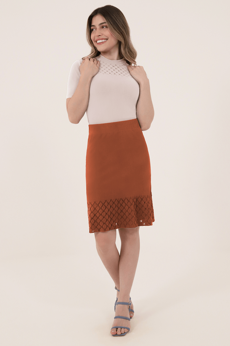 Confeccionada em renda sem costura e elastano 40, a Saia Scala possui comprimento próximo ao joelho e detalhes de mini losangos na barra.
