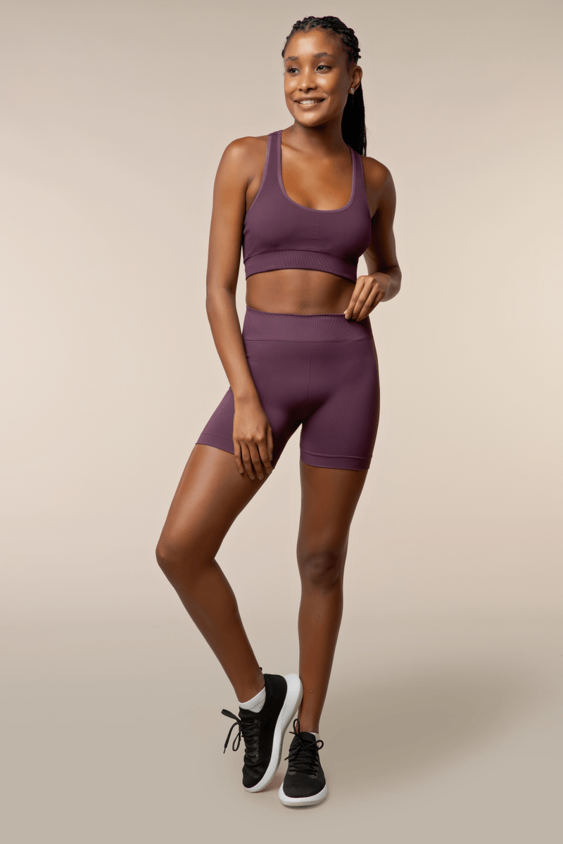 Short com cós duplo, firme, canelado e sem costuras. Recorte anatômico e costura flat no entrepernas para não marcar. Faixas laterais caneladas. Trama com desenhos canelados em formato de chevron. Acabamento antimicrobial. Tecnologia sem costura.
