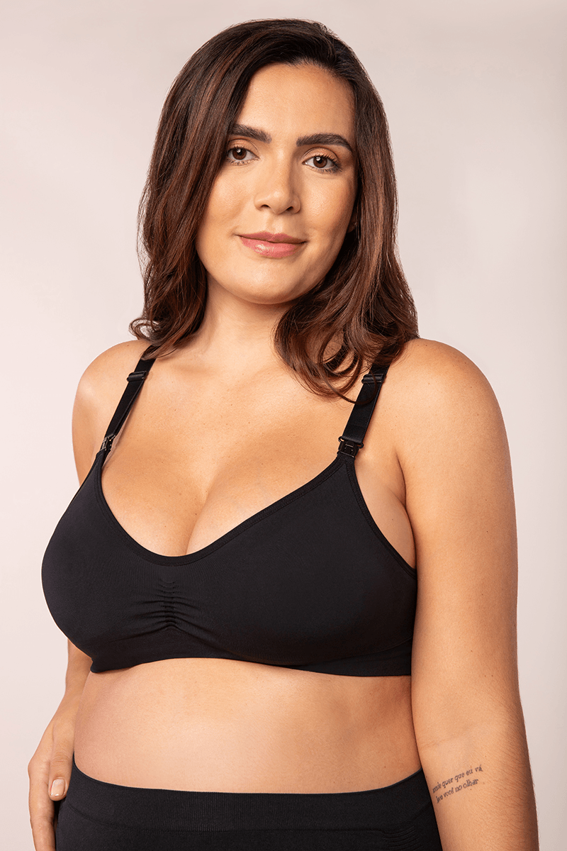 Sutiã amamentação sem bojo e sem aros, possui fecho com click frontal para facilitar a amamentação, alças ajustáveis e removíveis. Confeccionado em tecnologia sem costura. Laterais e alças mais largas p maior sustentação e segurança, fecho em colchete. O franzido na parte central acomoda os seios com conforto e sem compressão. Poliamida 93%, Elastano 7%.