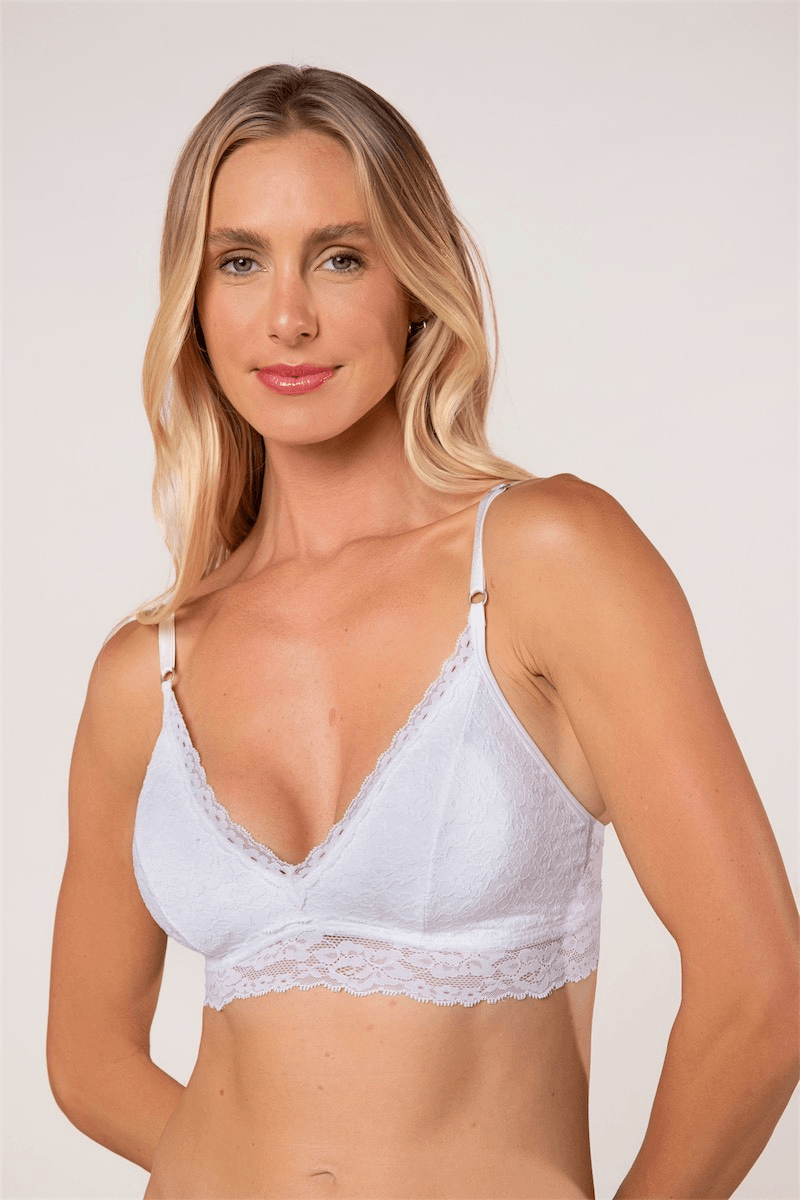 Ideal para seios pequenos e médios. Média cobertura e média sustentação. Top triângulo sem aros e com bojo removível. Alças reguláveis. Renda floral laise, ideal para usar com blusas decotadas. Possui forro para menor transparência. Composição: 90% Poliamida, 10% Elastano.