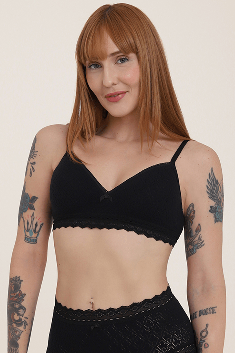 Soutien triângulo sem aros, com detalhe em renda no decote e na base. Média cobertura e sustentação. Feito em renda sem costura com bojo triângulo. Não aperta e não marca sob a roupa. Tecnologia renda sem costura. Composição: 92% Poliamida, 8% Elastano. Código do produto: I06490.