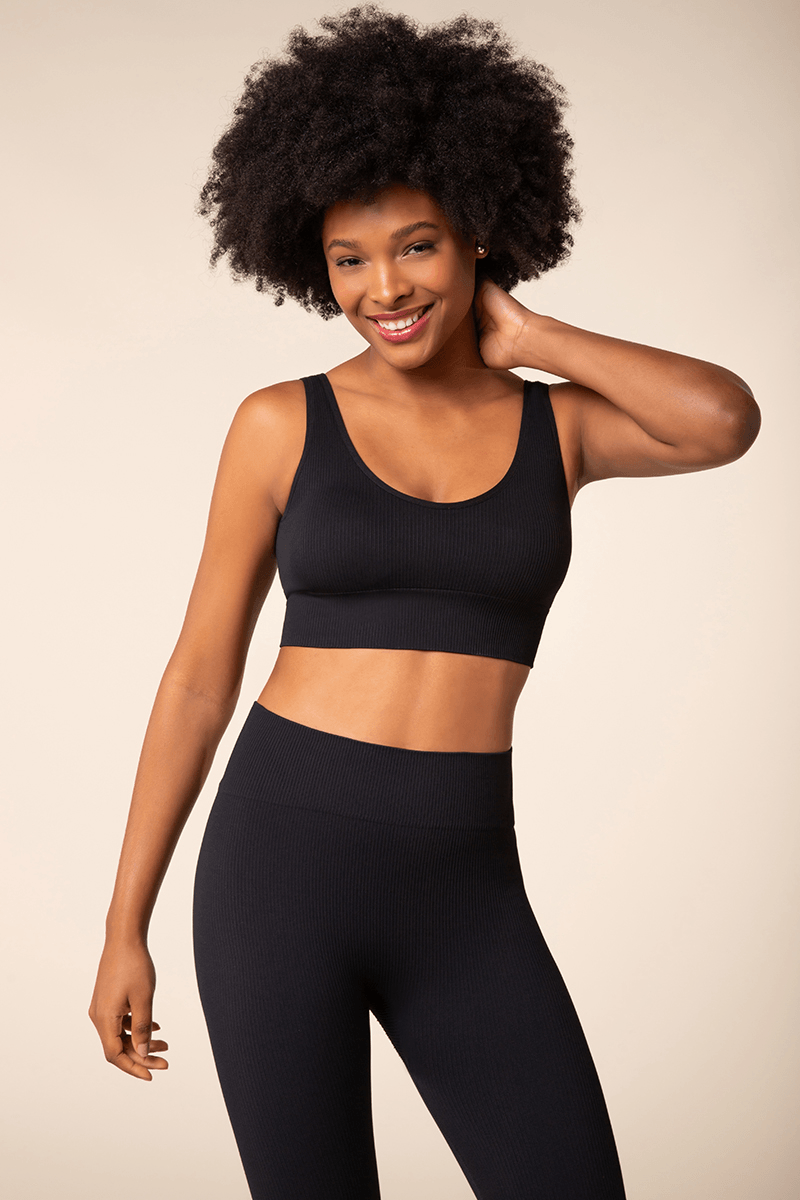 Top duplo canelado, com alças largas e cós largo canelado de base, com bojo removível. Com decote em U, sendo o decote traseiro mais profundo que o decote frontal. Oferece sustentação e segurança durante o uso. Possui acabamento antimicrobial e tecnologia sem costura.
