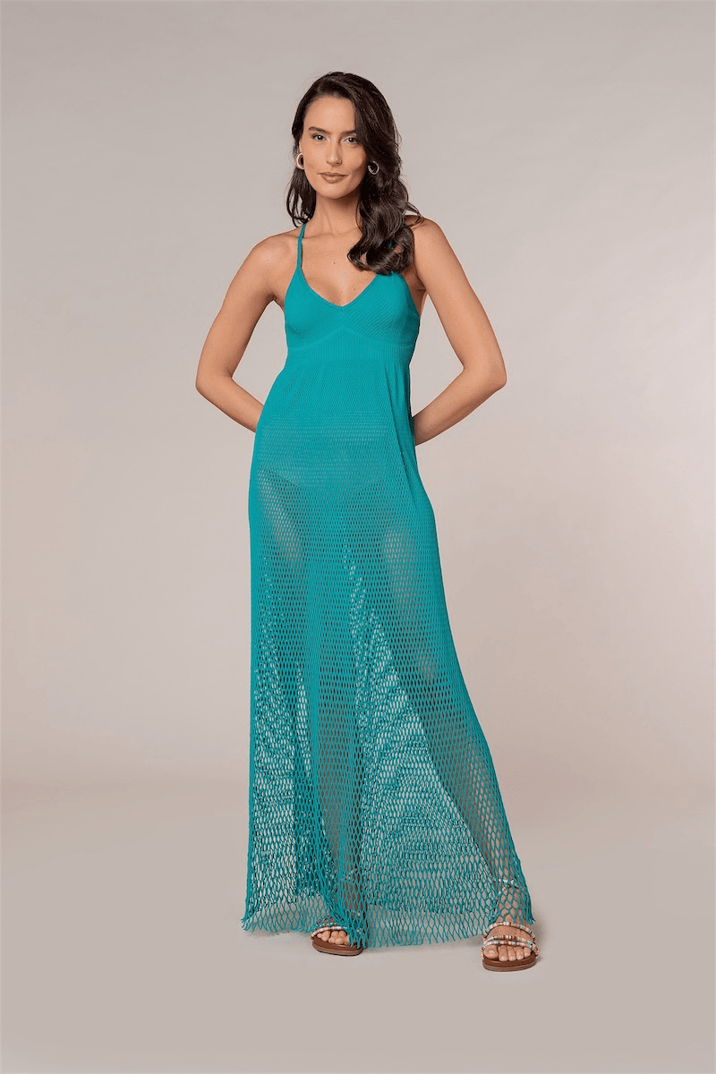 Vestido de alças cruzadas nas costas, busto justo com textura canelada e saia evasê com trama vazada. Ideal para usar como saída de praia ou até mesmo com hot pants ou modelador. Possui alta transparência. Confeccionado na tecnologia raschel em elastano 40.